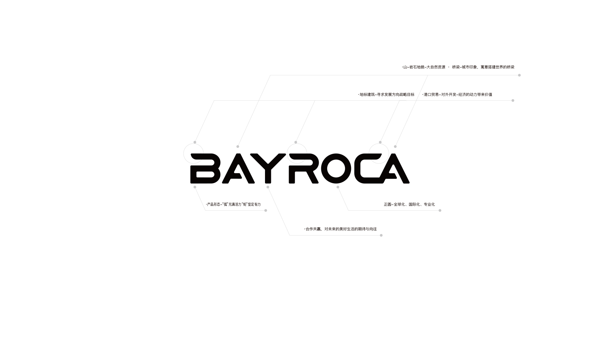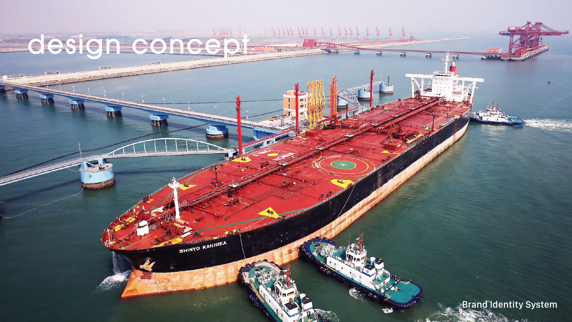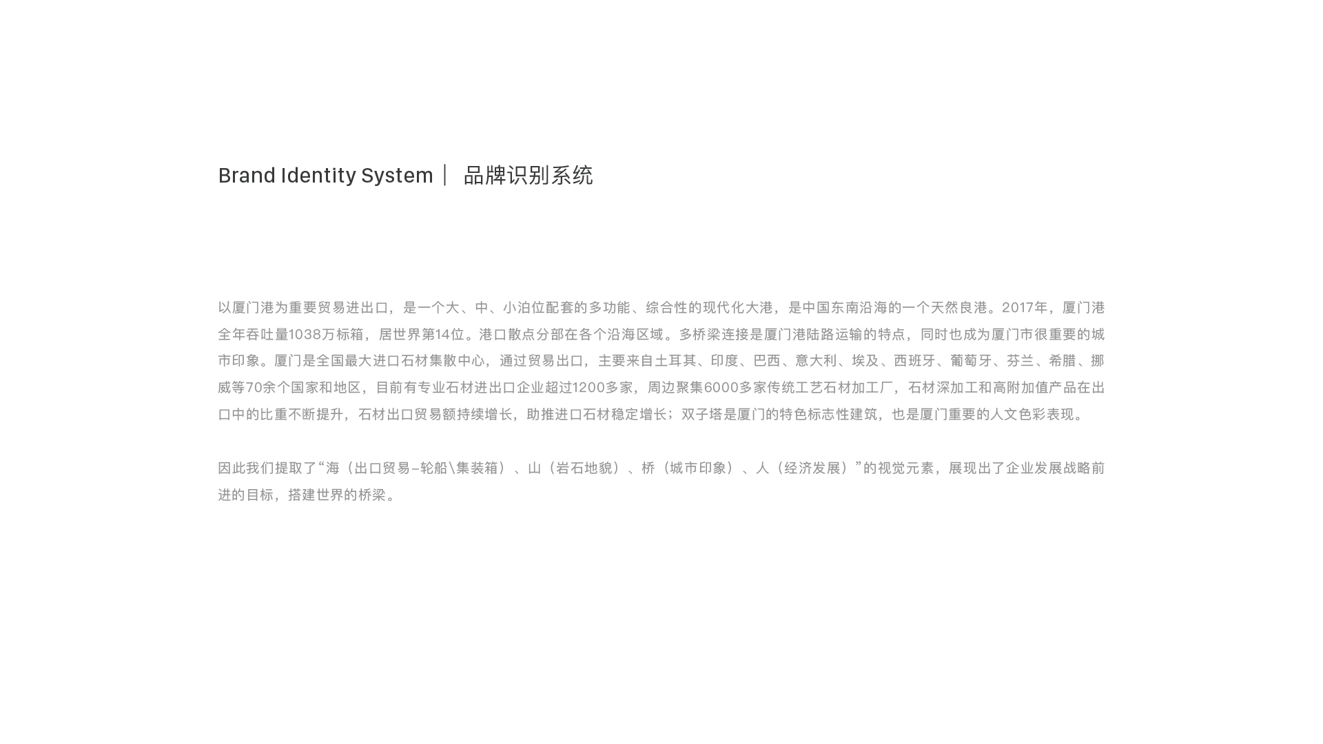 因此我们提取了“海(出口贸易-轮船\集装箱)、山(岩石地貌)、桥(城市印象)、人(经济发展)”的视觉元素,展现出了企业发展战略前进的目标,搭建世界的桥梁。